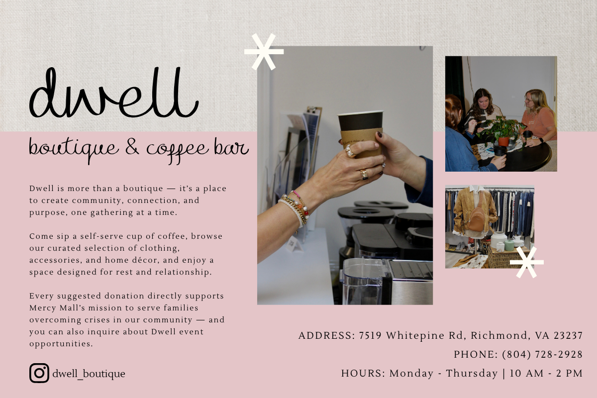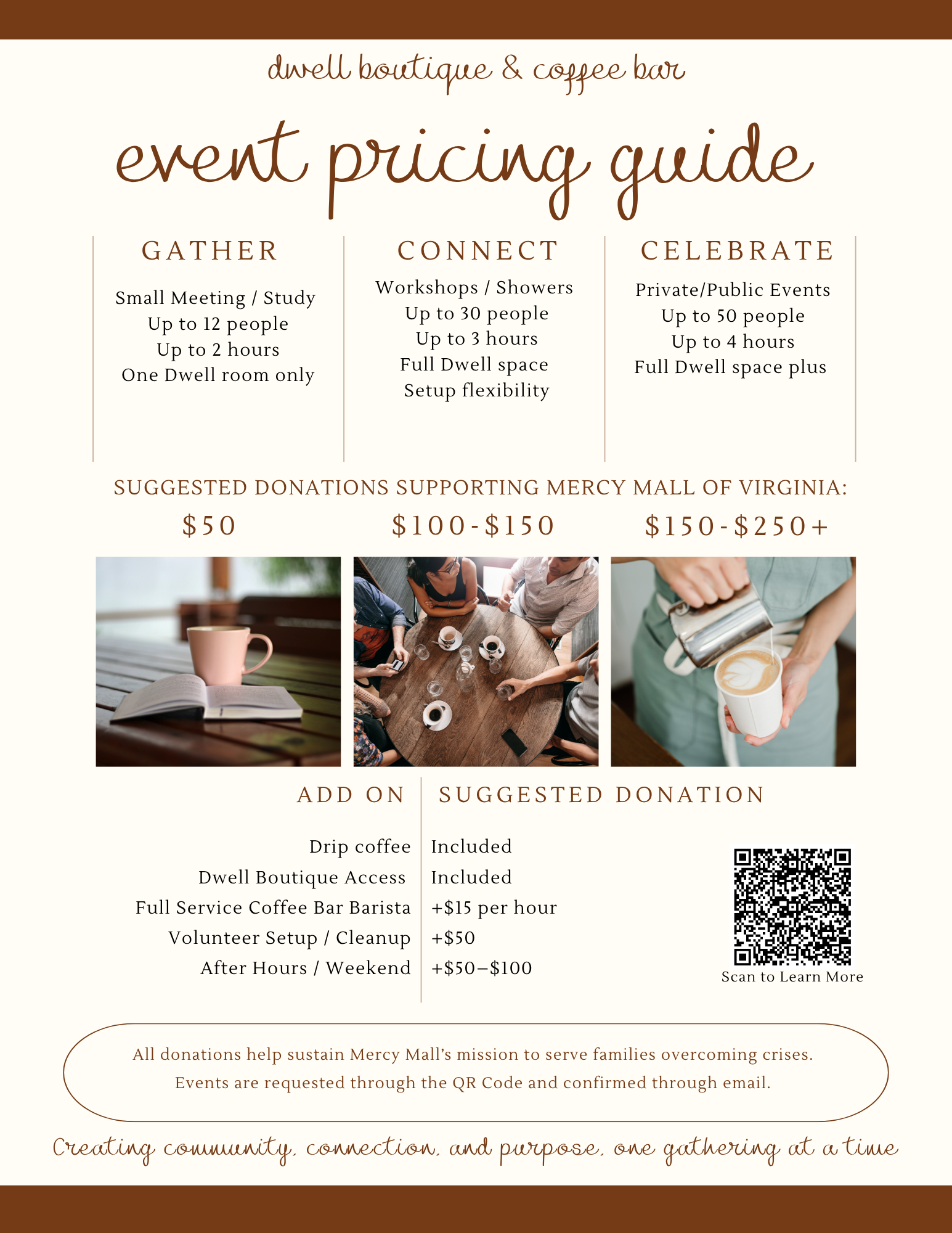 Dwell offers intimate, community-building event opportunities that also help fuel Mercy Mall’s mission. Whether you’re hosting a small gathering, team meet-up, or celebration, our space provides a warm atmosphere, optional barista service, and suggested-donation coffee — all operated by trained volunteers.